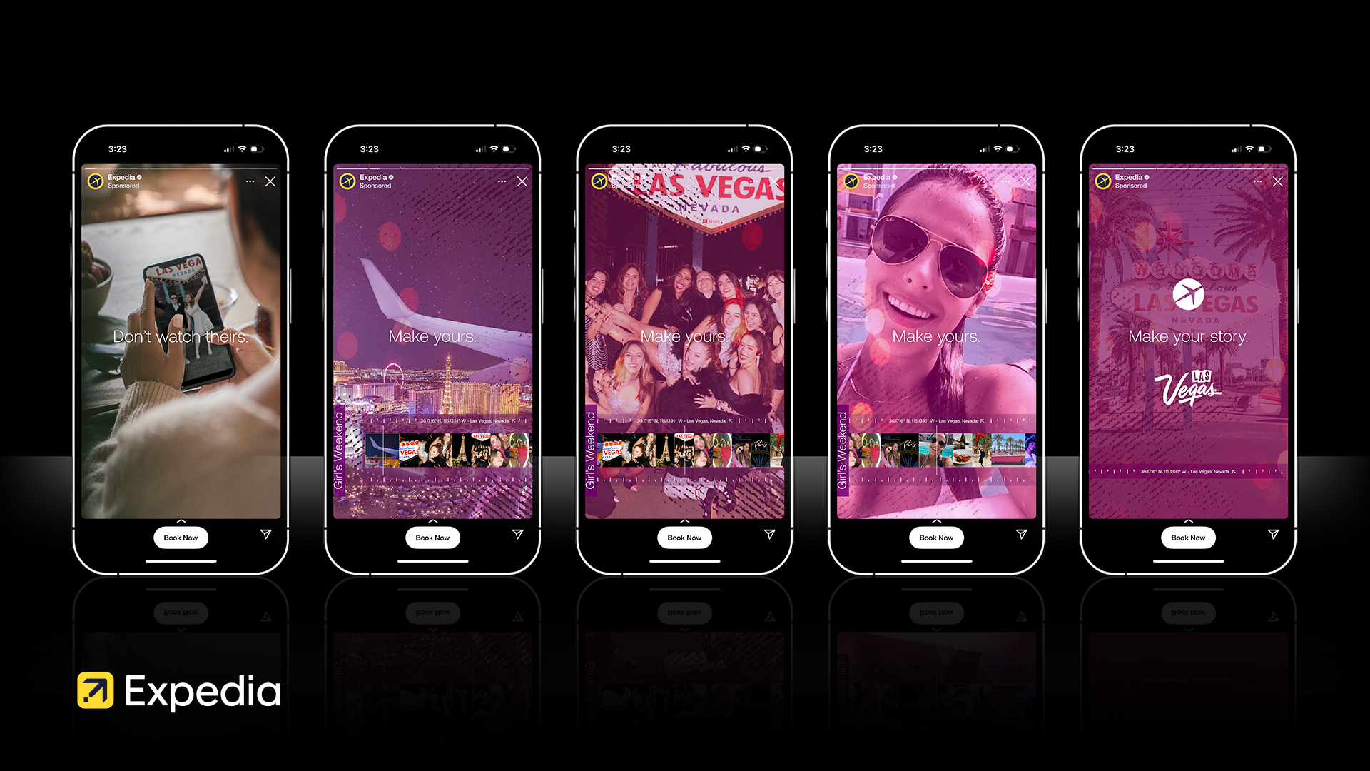 this Expedia social reel campaign highlights travel to Vegas and its goes through a persona's trip with a cameral roll type experience